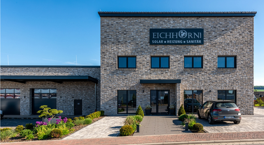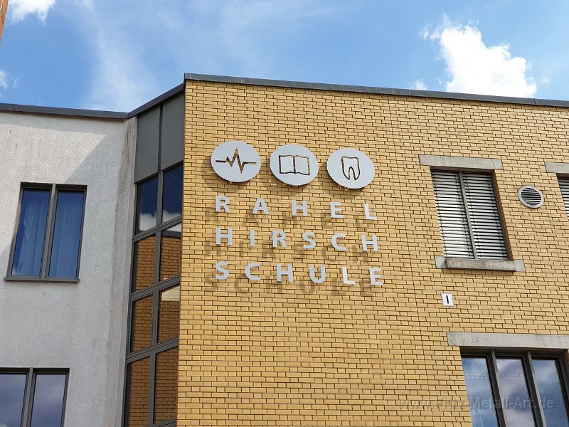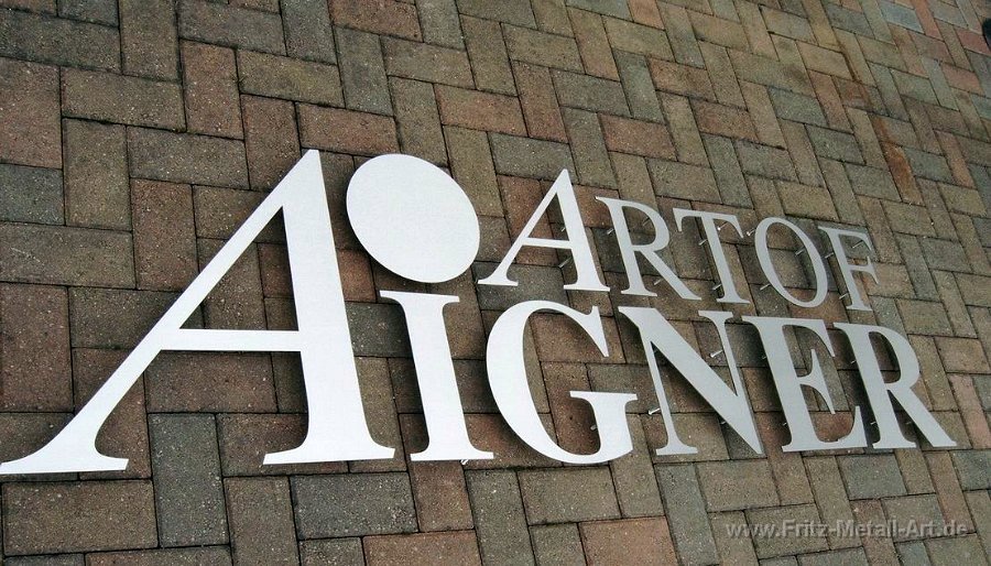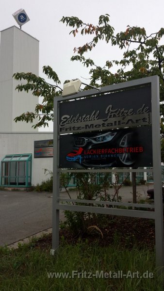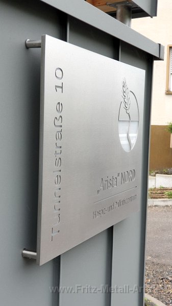 61 Firmenlogo aus gebürsteten Edelstahl auf Grundtafel die in der selben Farbe nach RAL wie das Gebäude Pulver beschichtet wurde.