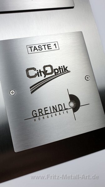 237 Edelstahl Beschriftung auf Glas, Kontrast wird durch Oberflächenbearbeitungen wie bürsten oder mattieren erreicht.