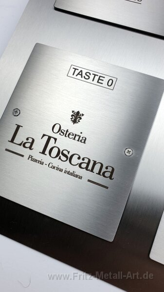 242 Tafel Edelstahl gebürstet mit ausgeschnittenen Schrift, mit LED`s hinterleuchtet.