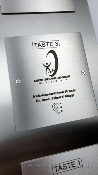 325 Tafel Edelstahl gebürstet mit ausgeschnittenen Schrift, die Ziffern lose. Mit Bolzen zur Abstandsmontage.