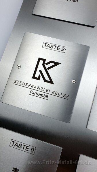 76 Firmenlogo aus gebürsteten Edelstahl auf Grundtafel die in der selben Farbe nach RAL wie das Gebäude Pulver beschichtet wurde.