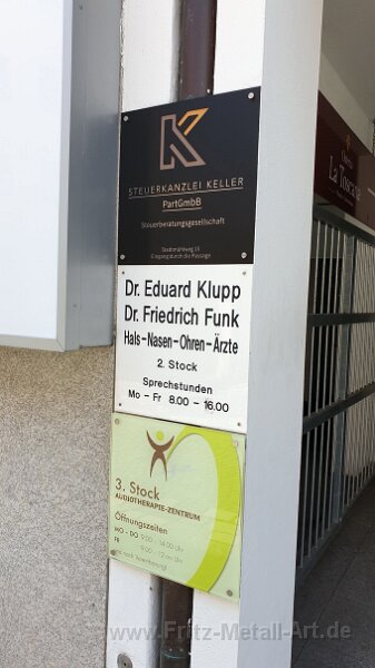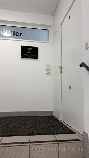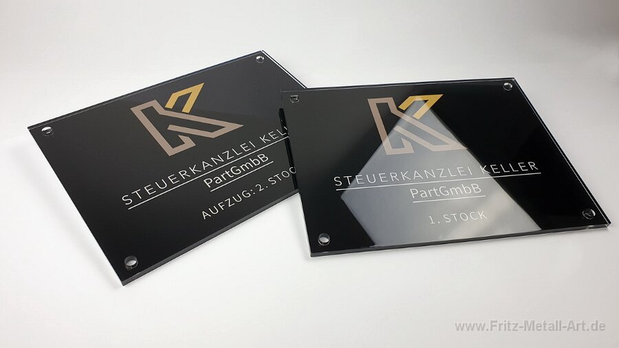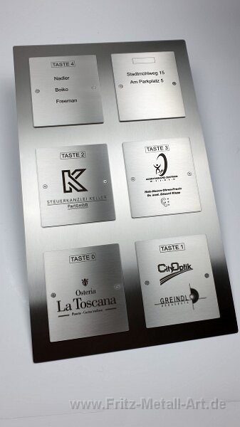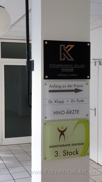 28 Firmenbeschilderung Rahmen aus massiven Edelstahl, Schilder aus Acrylglas von der Rückseite her graviert.