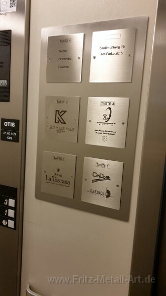 11 Aufzugbeschilderung. Grundplatte und Wechselschilder aus Edelstahl Montiert.