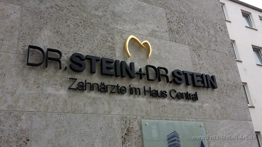 215 Schrift aus massiven 5 cm dicken Alu, matt schwarz Lackiert, den Zahn mit echten Blattgold beschichtet.Mit leichten Abstrand zur Fassade montiert.