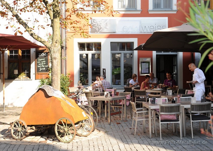 233 Auf dem Berg / Leiterwagen im Vordergrund werden wir mit Kreide die Tagesmenüs geschrieben. Auch ein Werk von uns. Das Edelstahl oben soll Gletscher darstellen. Sogar mit Gipfelkreuz.