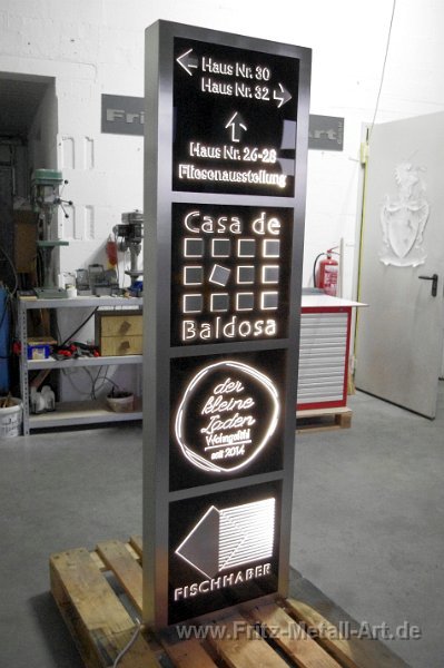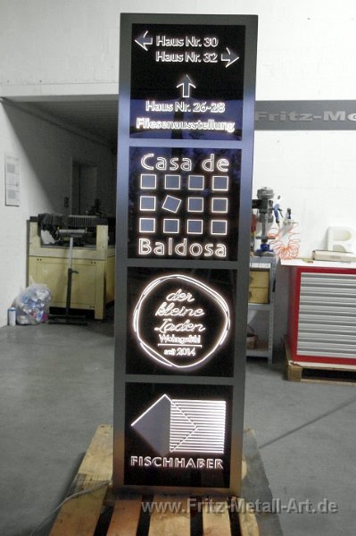 244 Stele aus Edelstahl, 1,8 x 0,5 Meter, mit vier Acrylfenster. Hinterleuchtet. Die Acrylplatten sind von der Rückseite her graviert, damit das Licht durch scheint, auf dem Acryl sind die Logos mit Edelstahl erhaben aufgebracht.