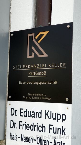 229 Schrift aus massiven 5 cm dicken Alu, matt schwarz Lackiert, den Zahn mit echten Blattgold beschichtet.Mit leichten Abstrand zur Fassade montiert.