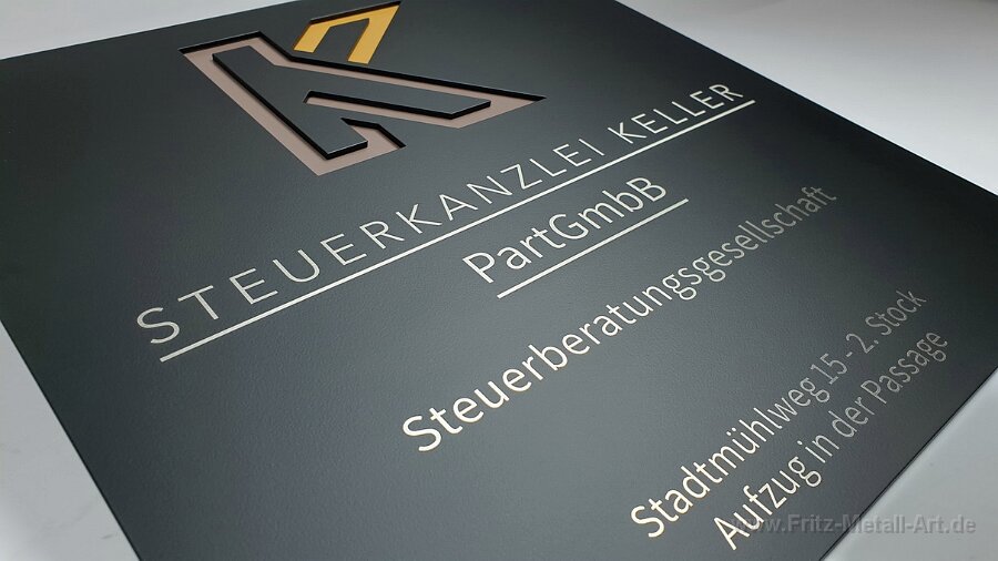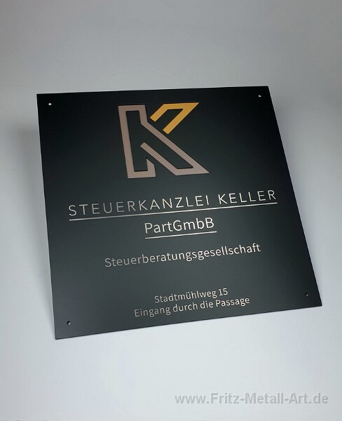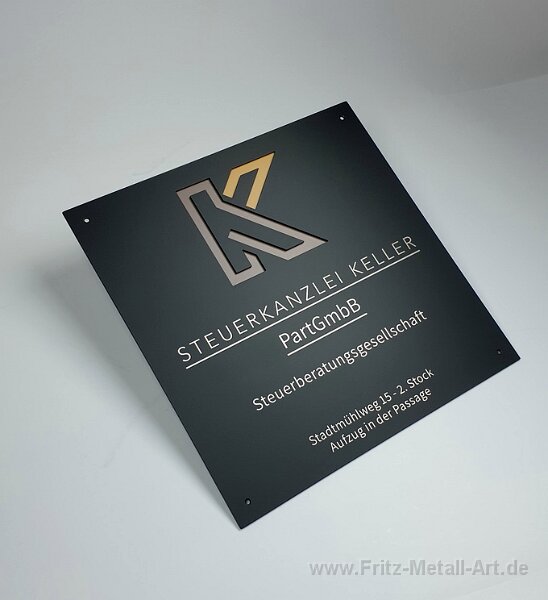 270 Grundtafel in Wunschfarbe mit auf Abstand montierten Edelstahl Schrift.