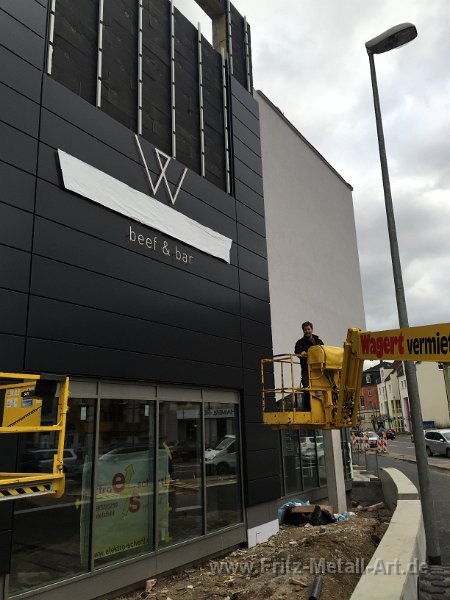 62 Firmenlogo aus gebürsteten Edelstahl auf Grundtafel mit den gesamt Maß von 1,5 x 5,4 Meter. Die Buchstaben sind in 3 D gemacht, das heißt sie haben eine Tiefe von 30 mm.