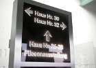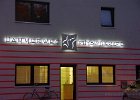 213 Grundtafel in Wunschfarbe mit auf Abstand montierten Edelstahl Schrift die mit LED`s hinterleuchtet ist. Komplett montagefertige Platte. Hier montiert an der Fassade.