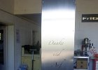 221 Edelstahl Beschriftung auf Glas, Kontrast wird durch Oberflächenbearbeitungen wie bürsten oder mattieren erreicht.