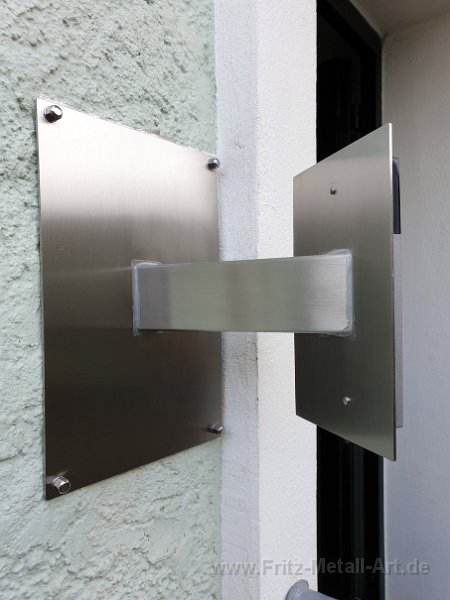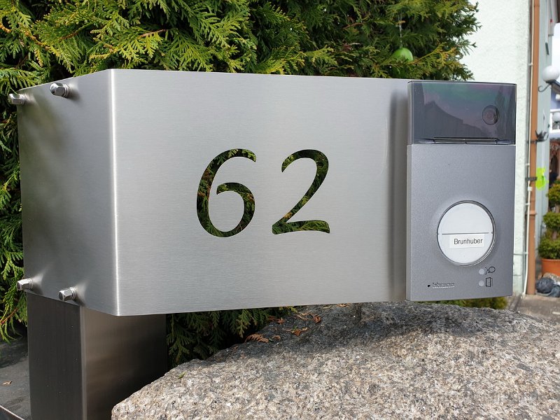 27 Ersatz für die alte Sprech - / Klingelplatte, Edelstahl Vierkantrohr. gekantetes VA Blech mit ausgeschnittenen Hausnummer für die Videosprechstellen.