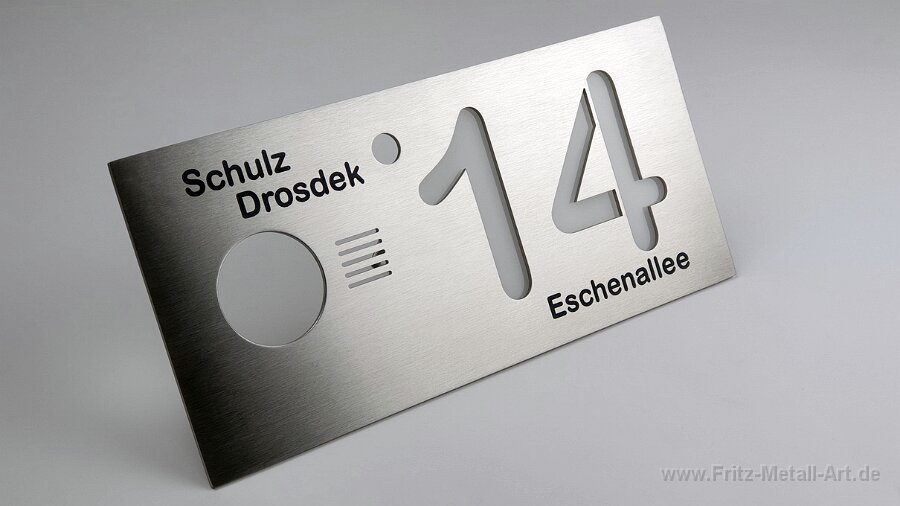 17 Schrift aus 2 mm dicken Edelstahl die mit Gewindebolzen mit leichten Abstand montiert sind. Der i-Punkt ist der Klingeltaster mit LED-Beleuchtung.